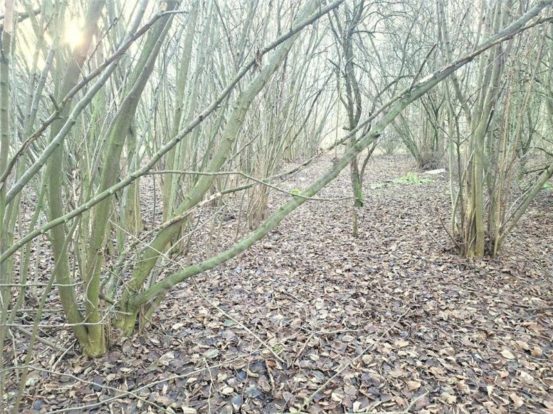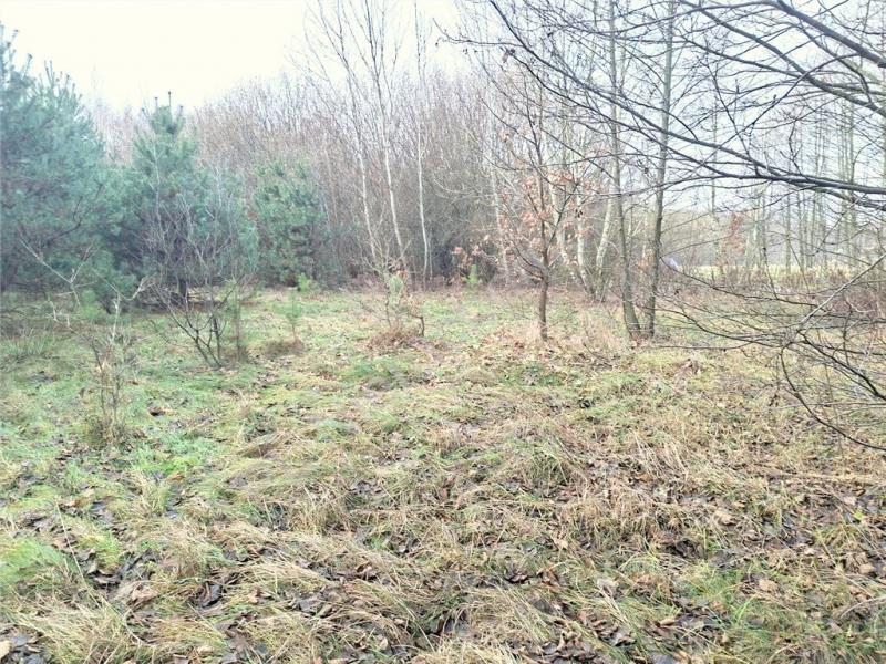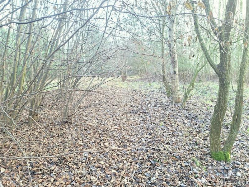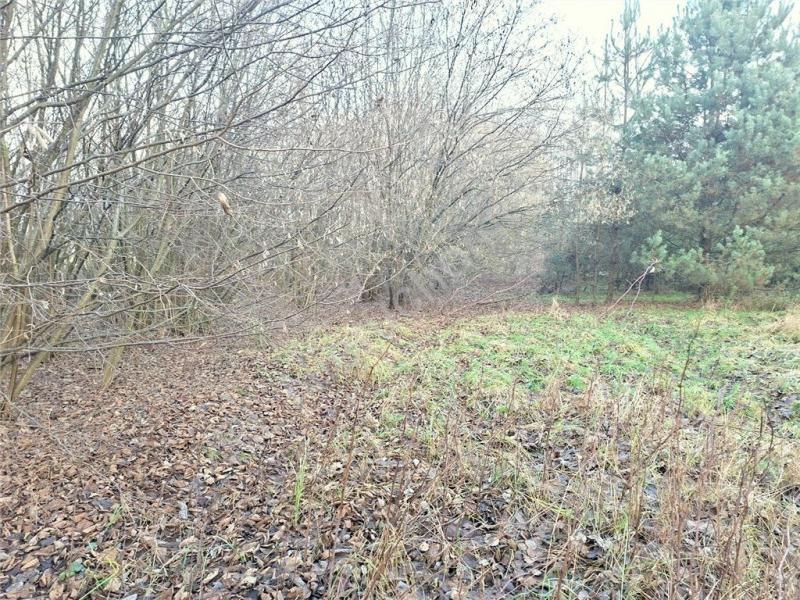 Działka porośnięta drzewami i krzewami.